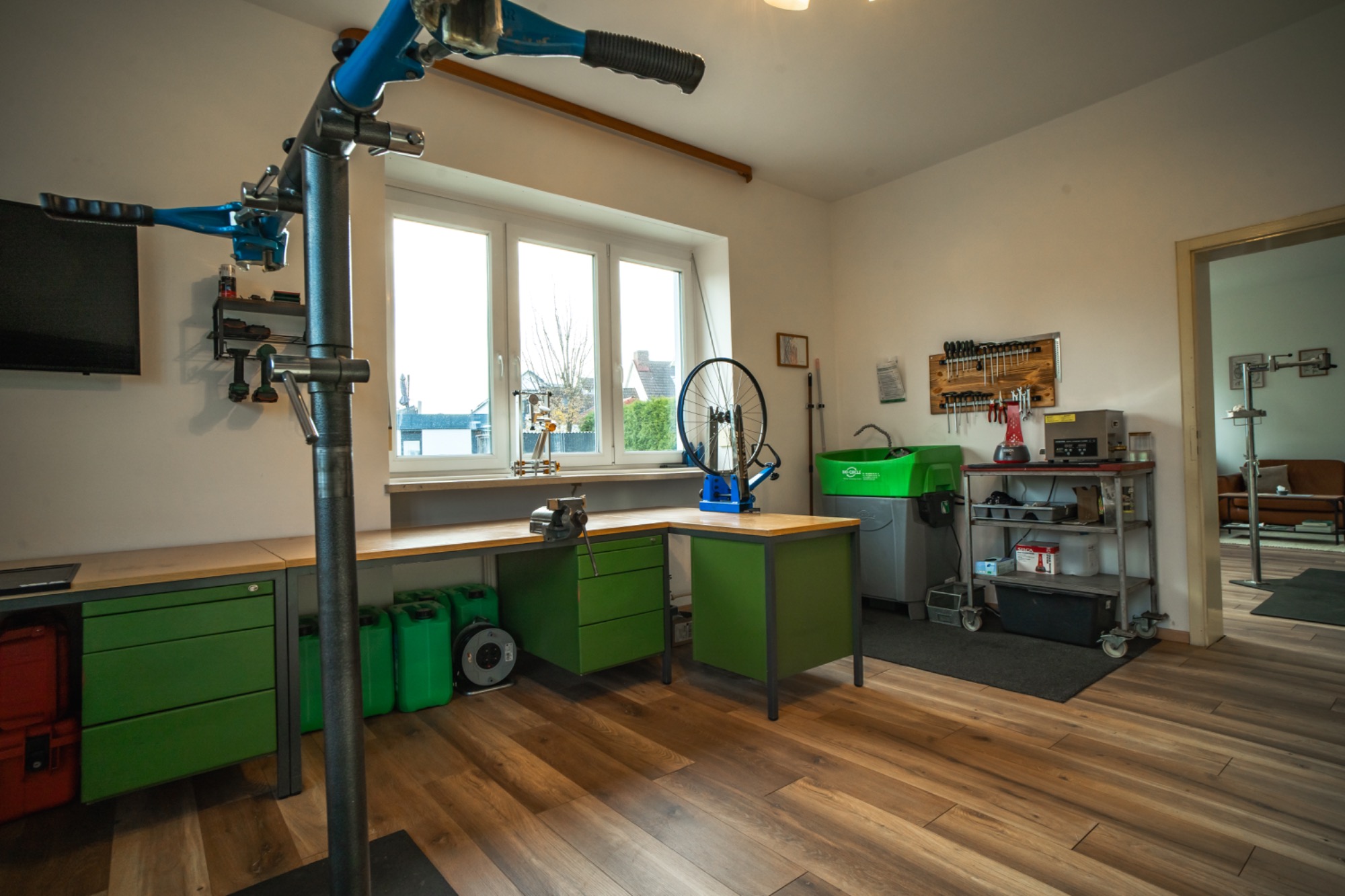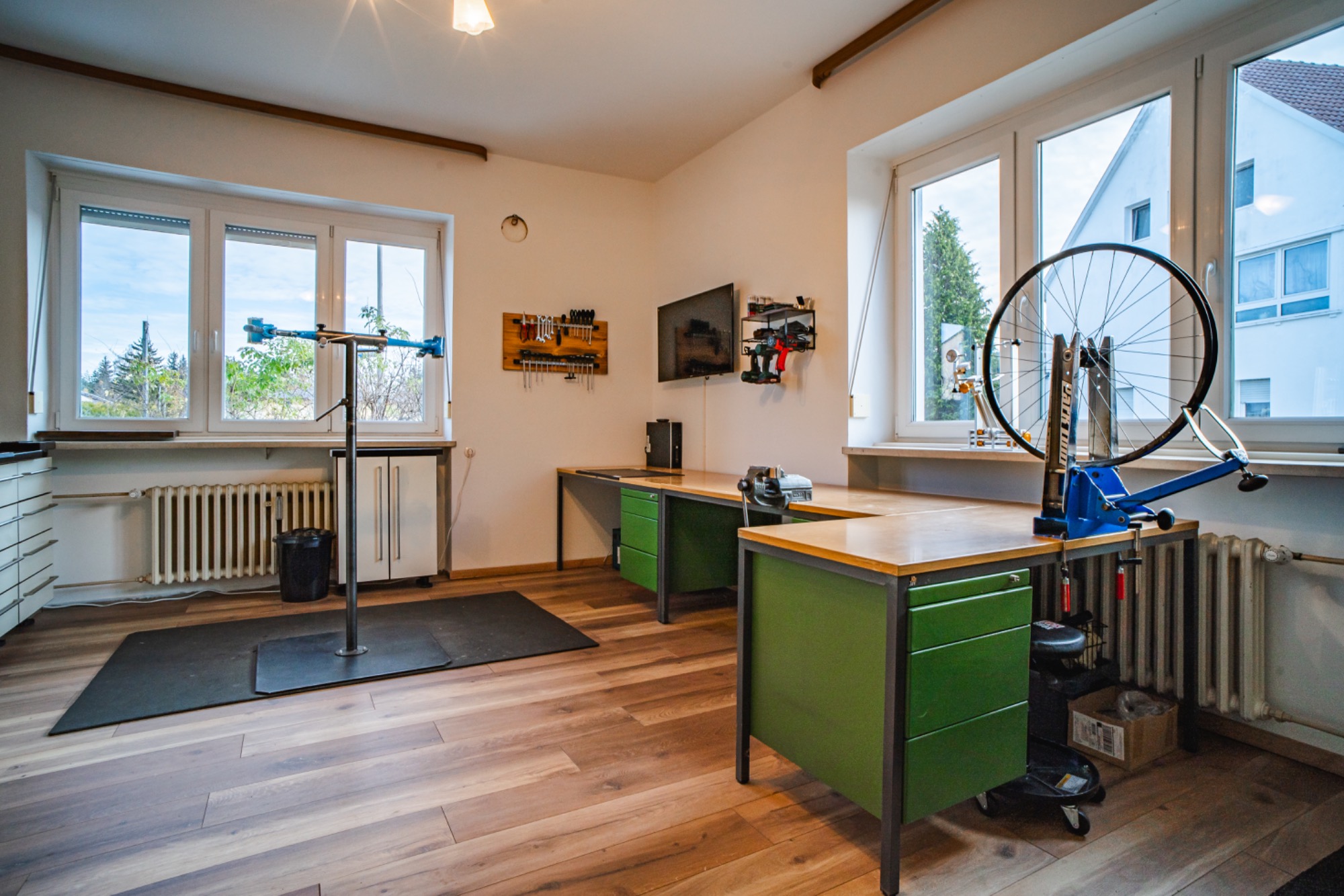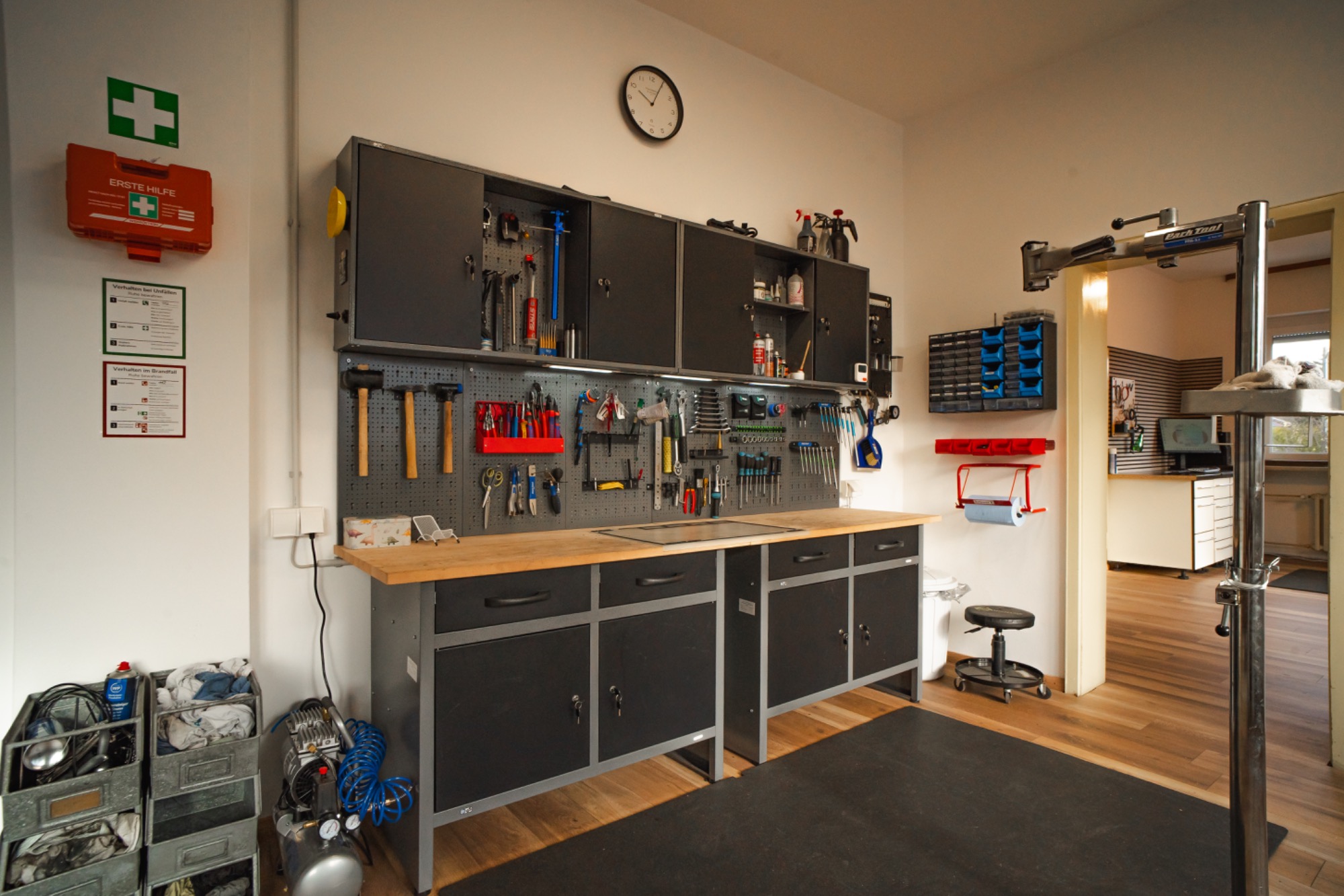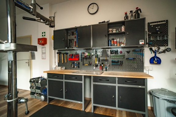 Die Kursräume befinden sich in Neugablonz (Ortsteil von Kaufbeuren), welches in der Nachkriegszeit als Wirtschaftswunder und mit seiner Modeschmuck Industrie bekannt geworden ist. In einem ehemaligen Gablonzer Schmuckbetrieb habe ich hier mit einer Mischung aus Wohnzimmer und Werkstatt eine gemütliche Atmossphäre zum Schrauben lernen geschaffen.